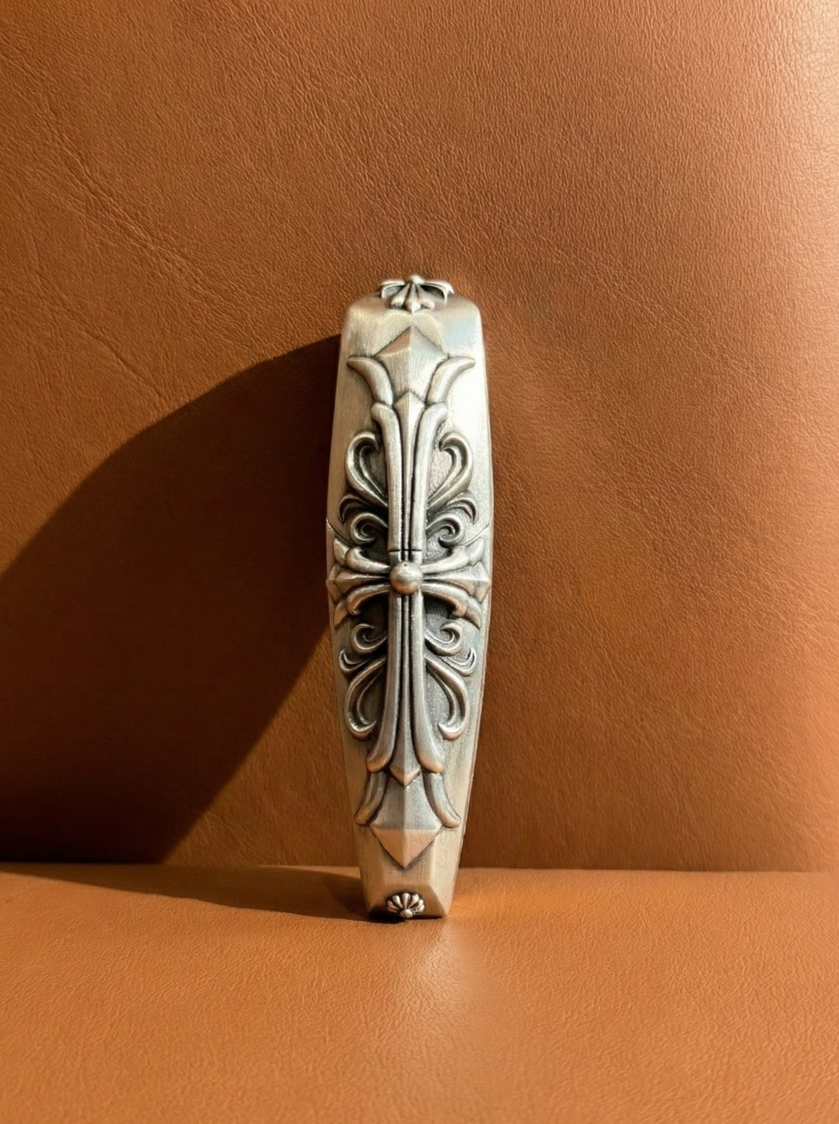 Cross motifs and floral metalwork inspired by classic European gothic craftsmanship for a bespoke boutique look.