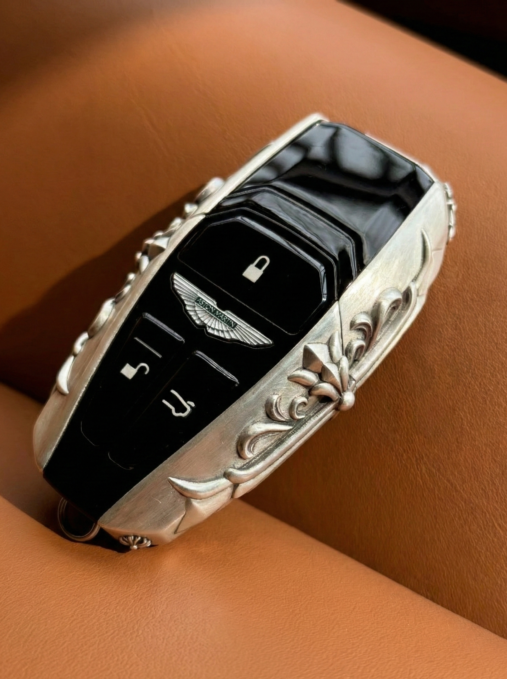 This 925 sterling silver key case features deep gothic floral engravings and cross-inspired detailing, delivering a bold, handcrafted aesthetic that elevates the Aston Martin smart key into a jewelry-grade accessory.